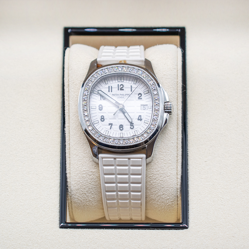凹凸のある格子状のホワイトダイアル、緩やかなカーブを描いたオクタゴン(八角形)のケースフォルム、ベゼルに配された46個のダイヤモンド、そして最高の強度と紫外線に対する抵抗力を誇るトロピカル・コンポジットバンドなど、スポーティでありながらも上品さを併せ持った非常に優雅な一本です。ムーブメントには電池式のシンプルなクォーツムーブメントCal.E19を搭載。歴史あるPATEK PHILIPPEの威厳を感じる逸品を是非ご堪能ください。